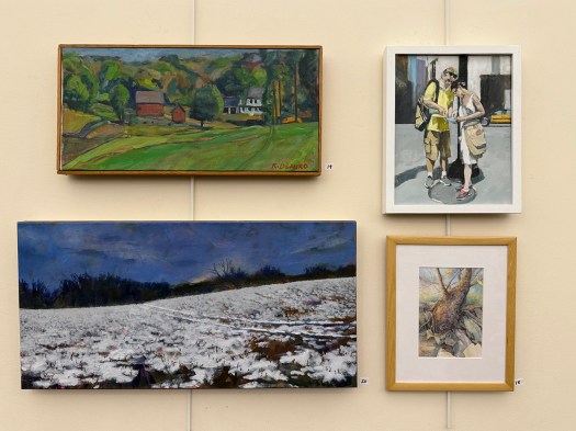 Top left: Rafael Dilauro, Red Corn Crib, North Guilford, oil painting; Top right: Scott Paterson, We’re Here, Barcelona, oil painting; Bottom left: Denise Casey: Wisconsin Cornfield, November, acrylic painting; Bottom, right: Elizabeth Hundt Scott, Busting Out, watercolor painting