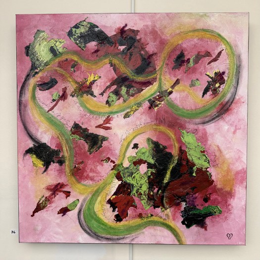 Left to right: Eileen Clark, Suspended Geometry, mixed media; Sharon R. Morgio, Royal, mixed media; Philp Backus, Sunshine, oil painting